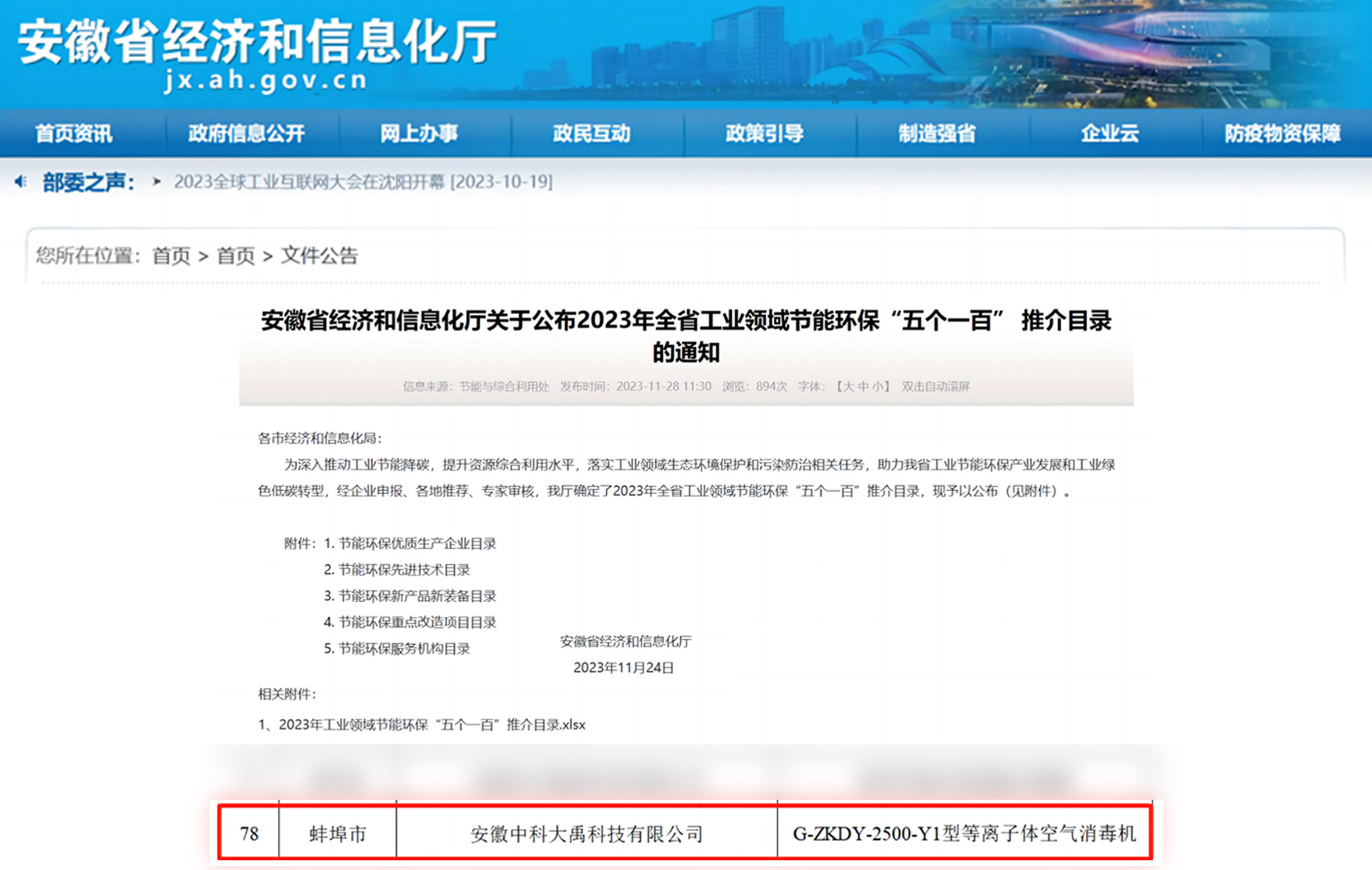 入選2023年全省工業領域節能環保“五個一百”推介目錄(節能環保新產品新裝備:G-ZKDY-2500-Y1型等離子體空氣消毒機)
