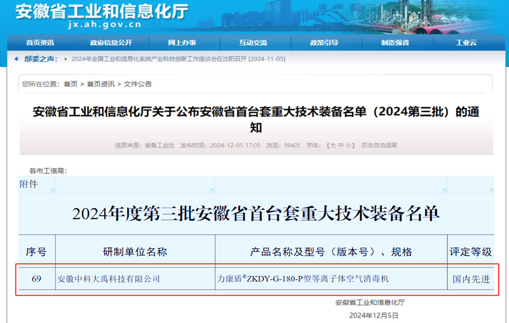 力康盾?ZKDY-G-180-P型等離子體空氣消毒機入選2024年度第三批安徽省首臺套重大技術裝備,評定等級:國內先進